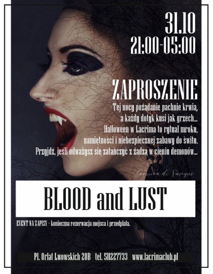 31 października Lacrima przemieni się w kryjówkę wampirów spragnionych nocy, ciała i rozkoszy. To czas, kiedy ciemność podsyca pożądanie, a goście pozwalają sobie na to, na co nie ma miejsca w świetle dnia.