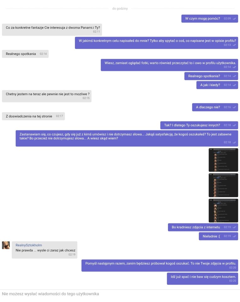 Użytkownik https://zbiornik.com/RealnySztokholm kradnie zdjęcia z netu, wstawia w profil jako swoje i oszukuje ludzi. A po kilku słowach prawdy, blokuje rozmówcę :) Uwaga !!!